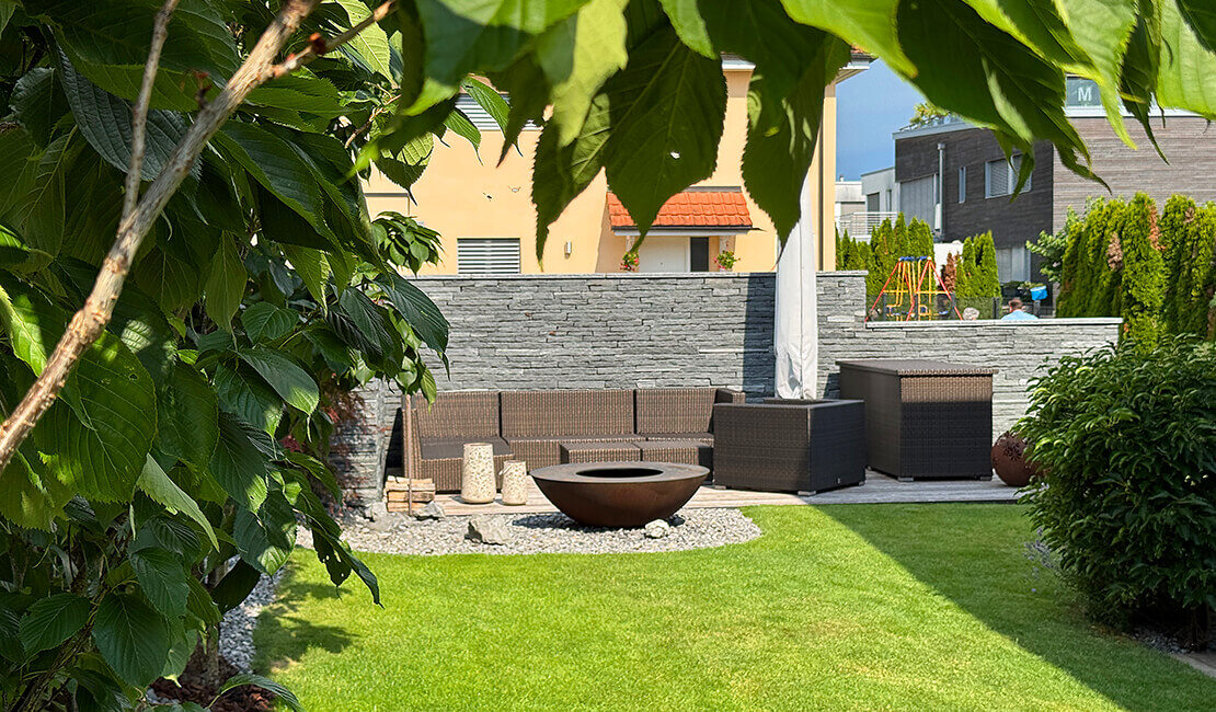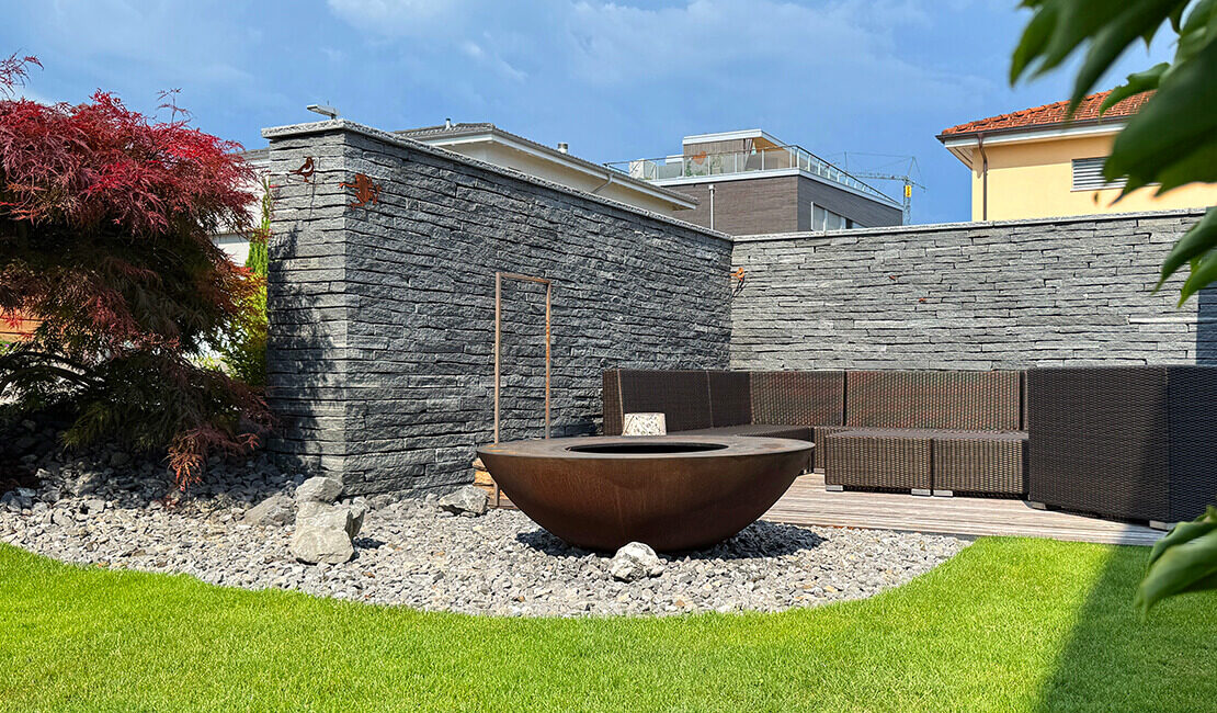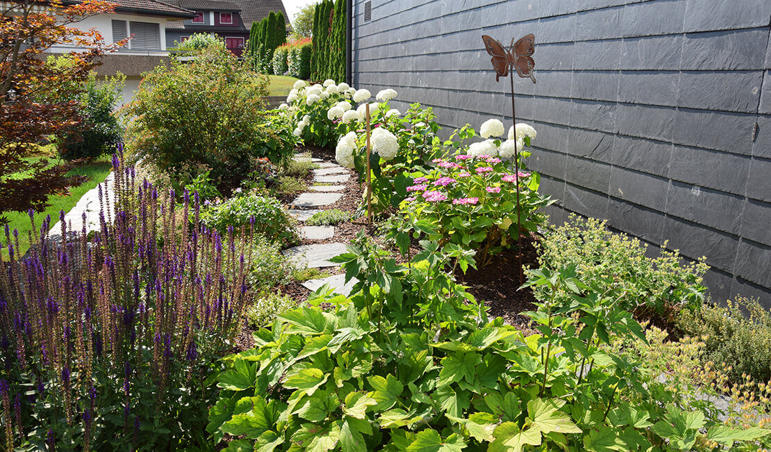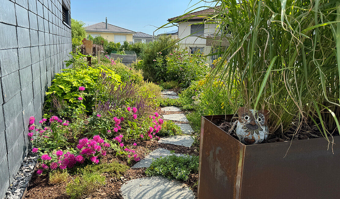 Seit Jahren dürfen wir diesen Garten pflegen und schon vor über zehn Jahren haben wir die ersten Gartenumgestaltungen vorgenommen. Ob die geschichtete Natursteinmauer, den Whirlpool oder die Terrainanpassung zum Nachbargrundstück Stück für Stück wurde der Garten zur Wohlfühloase. Im Frühling 2023 legten wir eine grosse Staudenmischpflanzung an, welche sich toll entwickelt hat und auch Flora und Fauna etwas bietet.
