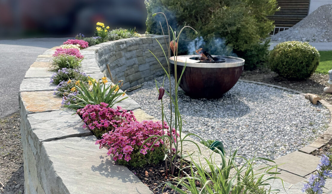 Die Bepflanzung wurde schlicht der Grundstücksgrenze entlang gehalten. Als Highlight steht ein Eisenholzbaum in der Mitte des Gartens und besticht vor allem mit seiner tollen orangen Herbstfärbung. Mit der Mauerkronen Bepflanzung wird der Garten abgerundet, bietet aber so auch den Blick in die weite zum Säntis.