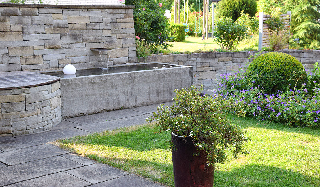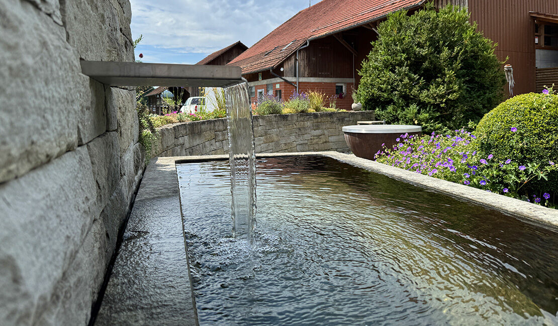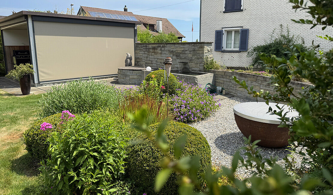 Nach der Rodung wurde Platz gemacht für neue Formen und Elemente. Der Sandstein zieht sich durch den ganzen Garten durch. Ob als Bodenbelag, als Mauer oder als Brunnen, in jeder Situation Zeitlos und einzigartig. Als Kontrast zum Rorschacher Sandstein wurde ein Holzrost aus Eiche als Bodenbelag, Treppe oder Sitzbank verwendet. Der überdachte Sitzplatz lädt zum Verweilen ein, auch wenn das Wetter mal umschlägt bietet er einen sicheren Rückzugsort.