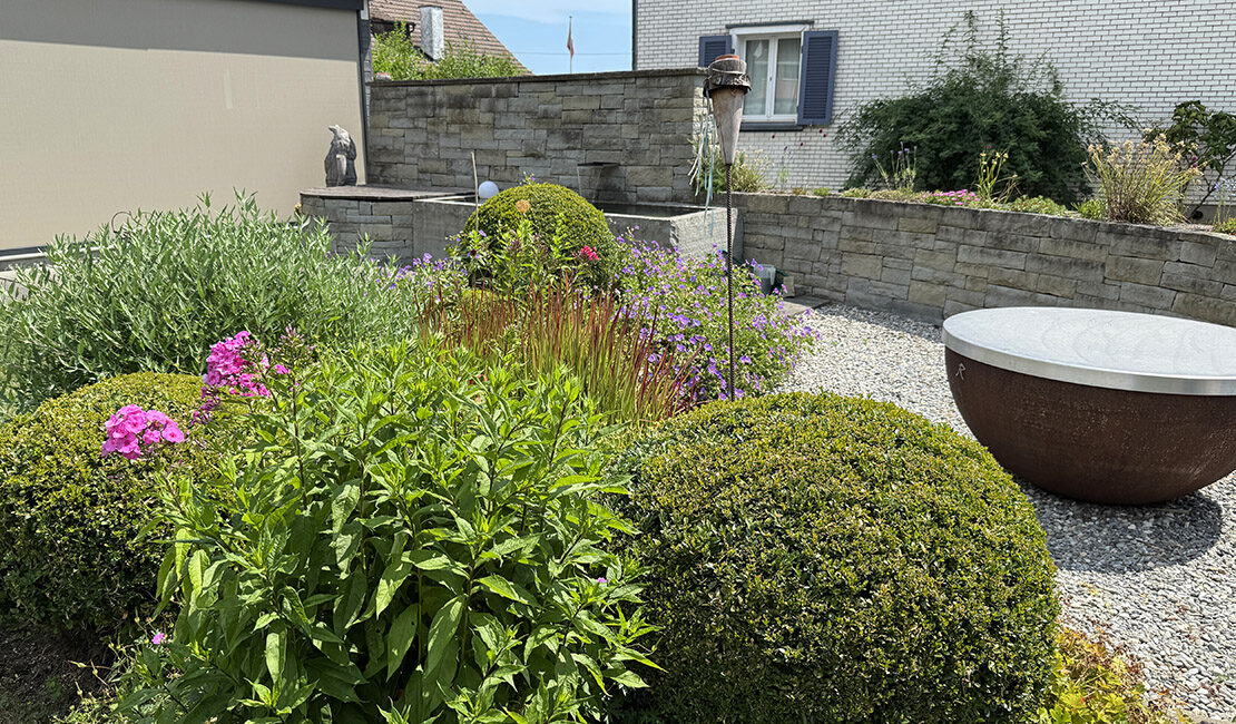 Bei diesem Projekt wurden über 25 Tonnen Rorschacher Sandstein verarbeitet. Vor der Gartenneugestaltung war es ein verwachsener alter Garten mit Hohen Nadelgehölzen.