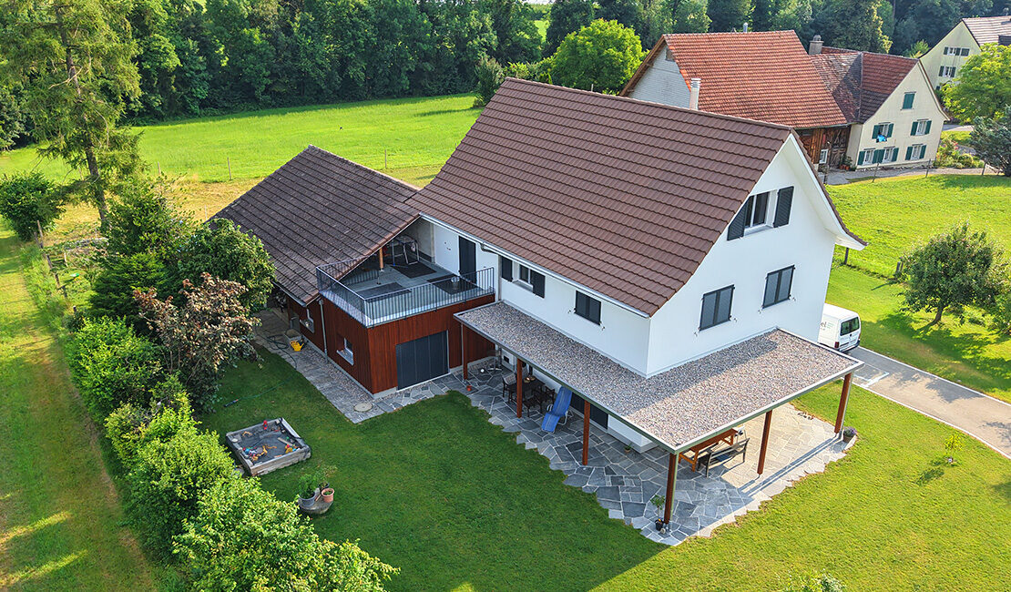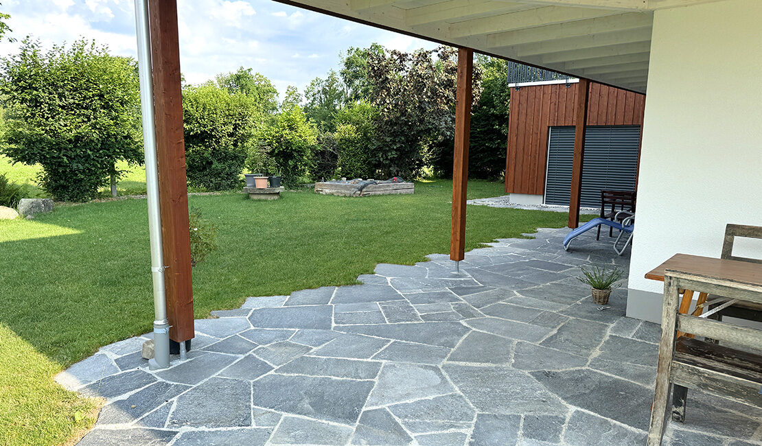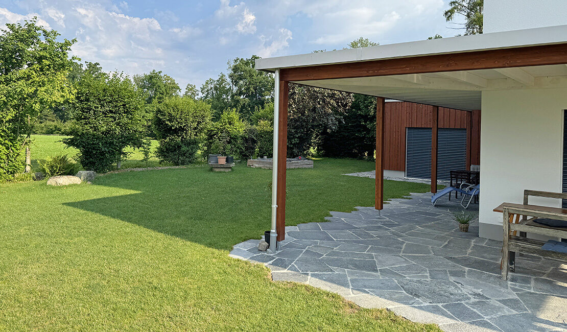 Bei diesem modernen ländlichen Haus wurde das alte Haus abgebrochen und mit einem Neubau ersetzt. Mit den Tessiner-Gneis-Platten welche noch vom Altbau vorhanden waren, wurde ein neuer Aussenbereich gestaltet. Die Natursteine konnten als Bodenbeläge wiederverwendet werden und erstrahlen in neuem Glanz. Mit einer einheimischen Buchenhecke wurde die bestehende Hecke ergänzt und ist so ein Natürlicher Zaun. Eine grosse Rasenfläche mit Sandkasten darf für die Kinder natürlich auch nicht fehlen.